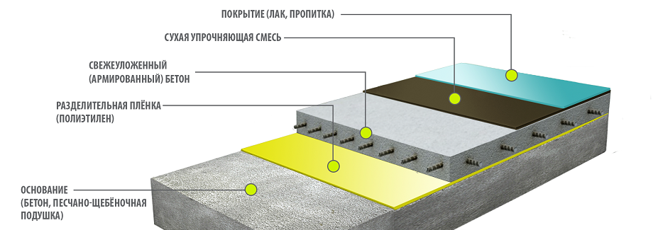 Практика показывает, что для создания покрытия используется две технологии. На свежеуложенный пол наносятся сухие усиливающие составы. Также может быть использована специальная пропитка уже уложенного бетонного пола. Пропитка может быть минеральной или органической, вне зависимости от состава она укрепляет кристаллическую решетку бетонного пола.
